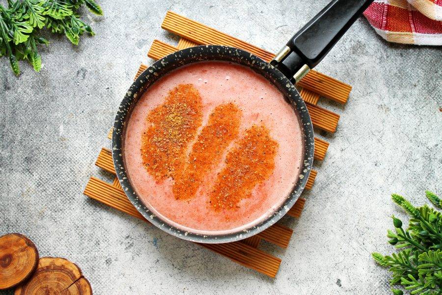 Перелейте соус в сковороду с обжаренным луком. Добавьте соль, перец и специи. Доведите до кипения, убавьте огонь и тушите в течение 10 минут.