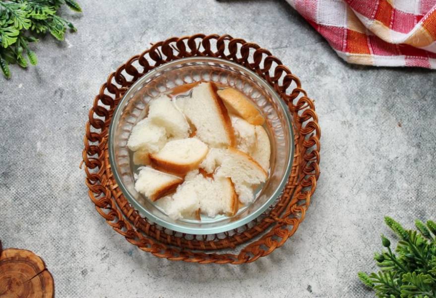 Булку разломайте на куски и замочите в холодной воде на 5 минут.