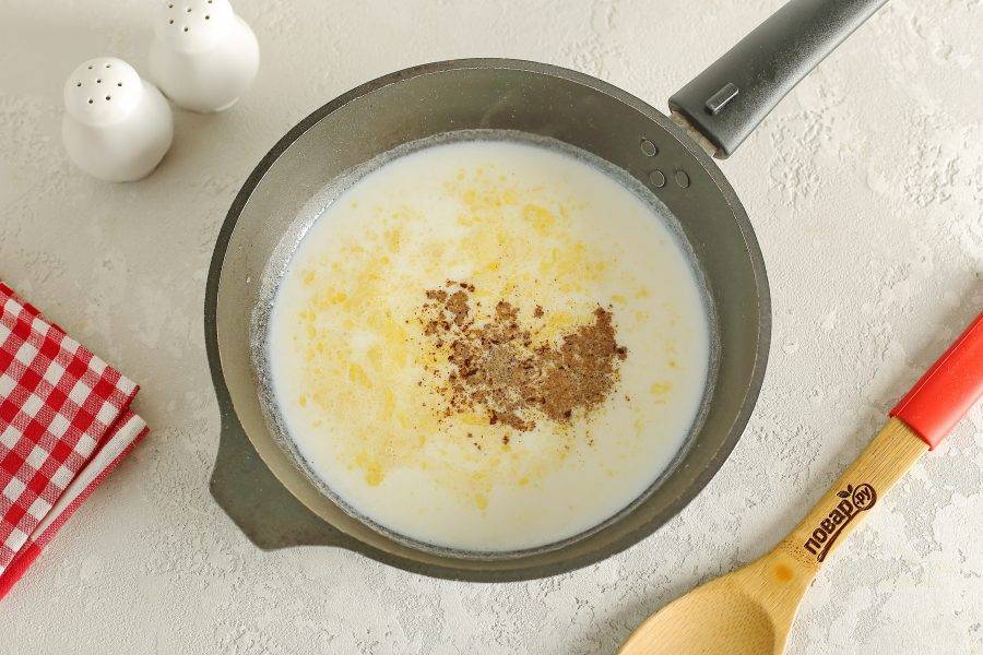 Тонкой струйкой влейте молоко, посолите соус по вкусу, добавьте мускатный орех и молотый перец.