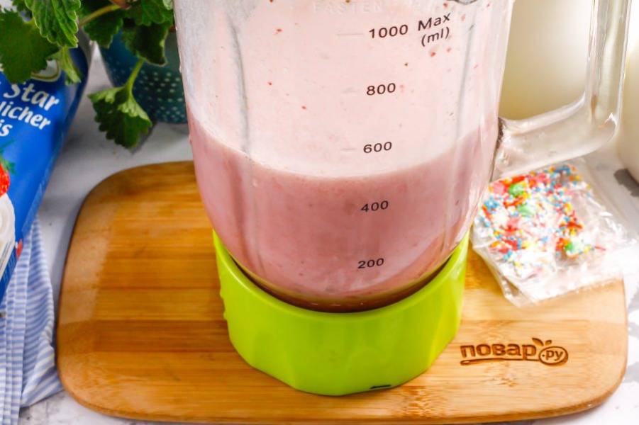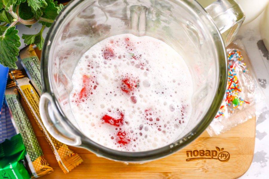 Взбейте все в течение 2 минут на пульсирующем режиме, чтобы кусочки клубники тщательно измельчились.