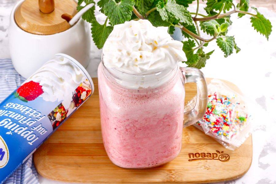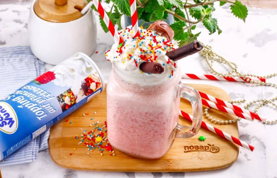 Перелейте приготовленный молочный коктейль в коктейльную банку и украсьте взбитыми сливками из баллончика. Либо взбейте сливки жирностью более 30% сами и выложите их сверху из кондитерского шприца, пакета.