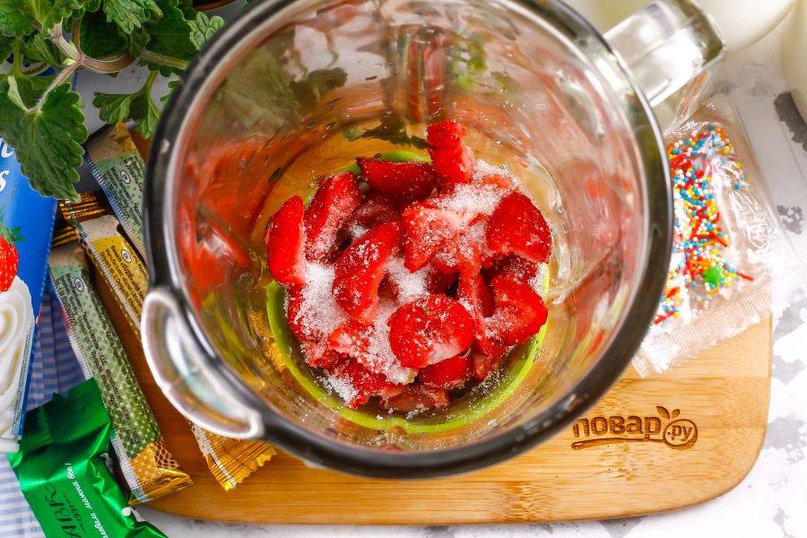 Клубнику промойте в воде, срежьте хвостики и нарежьте на части, высыпьте в чашу блендера или кухонного комбайна. Можно использовать любые ягоды с мелкими косточками или фрукты с неплотной мякотью. Добавьте сахарный песок.