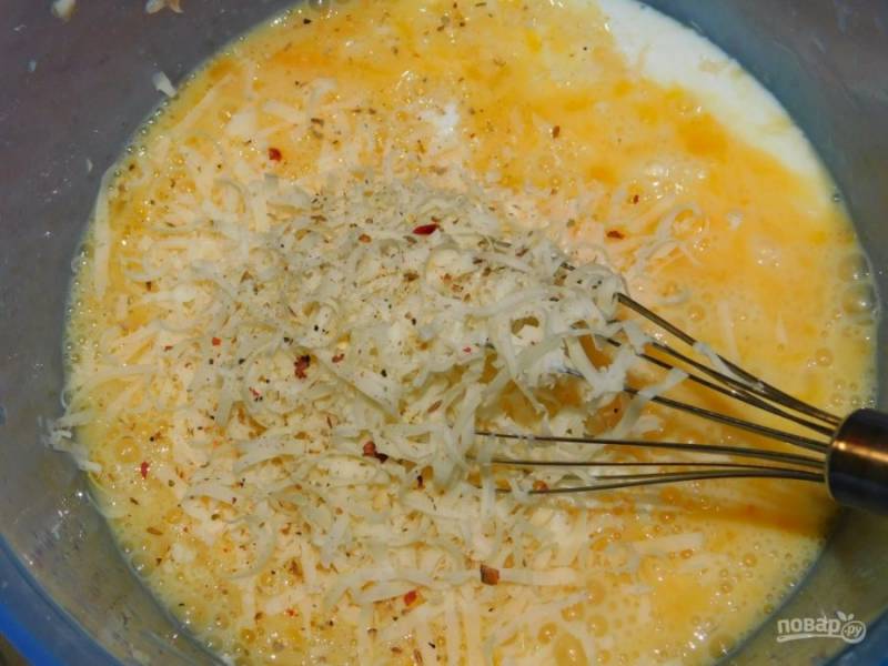 Отдельно смешайте яйца, молоко и тертый сыр. Добавьте немного специй.