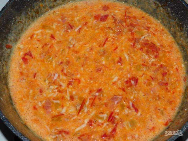Залейте яичной смесью овощи и готовьте под крышкой на маленьком огне до готовности яиц, минут 10.