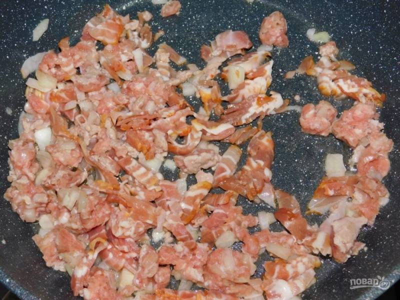 Бекон мелко нарежьте и обжарьте с фаршем, а также мелко нарезанным луком.