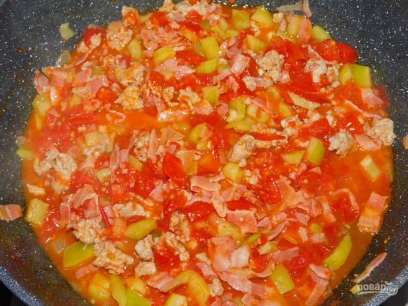 Добавьте нарезанные помидоры и болгарский перец. Накройте крышкой и тушите все вместе минут 5-7.