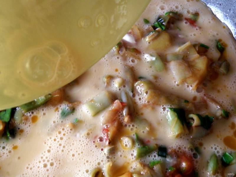 Яйца венчиком смешайте с соевым соусом и томатным соком. Добавьте горсть мелко натертого сыра. Посолите по вкусу и залейте овощную смесь.