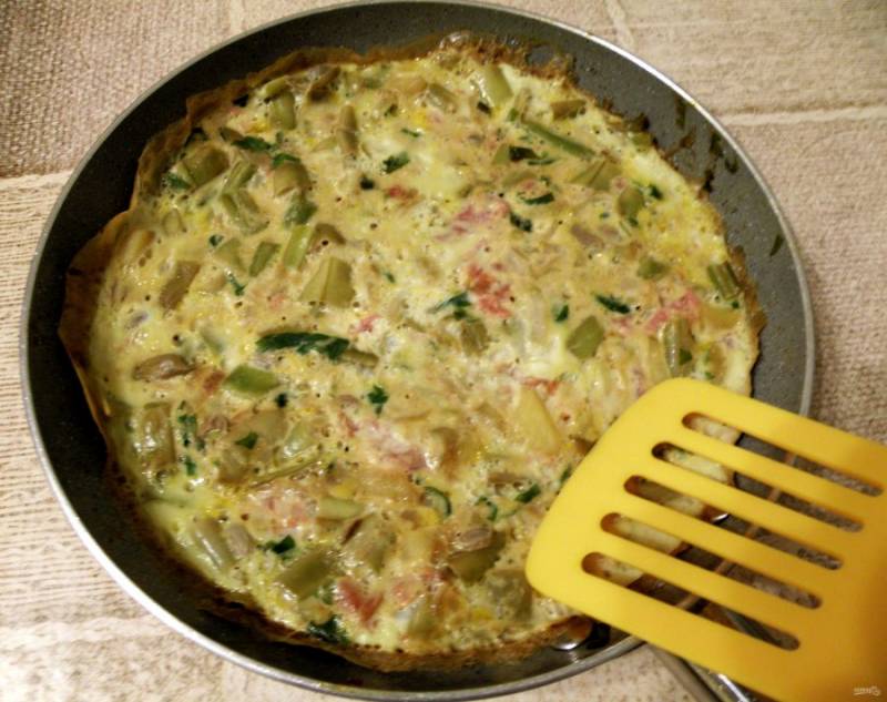 Готовьте на небольшом огне под крышкой до загустения. Не мешайте. Можно приготовить фриттату и в духовке, если не слишком жарко.