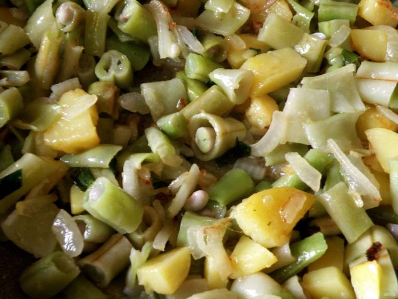 Добавьте подготовленную фасоль, нарезанные кубиками перец и помидор без семян. Тушите пару минут, посолив по вкусу.