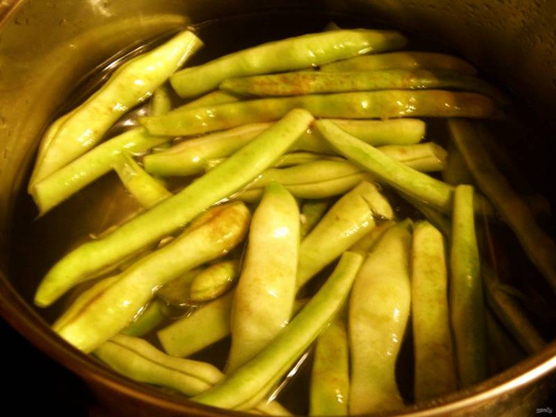 Стручковую фасоль опустите в кипящую воду на пару минут, затем обдайте ледяной водой. Обсушите, удалите жилки и нарежьте кусочками.