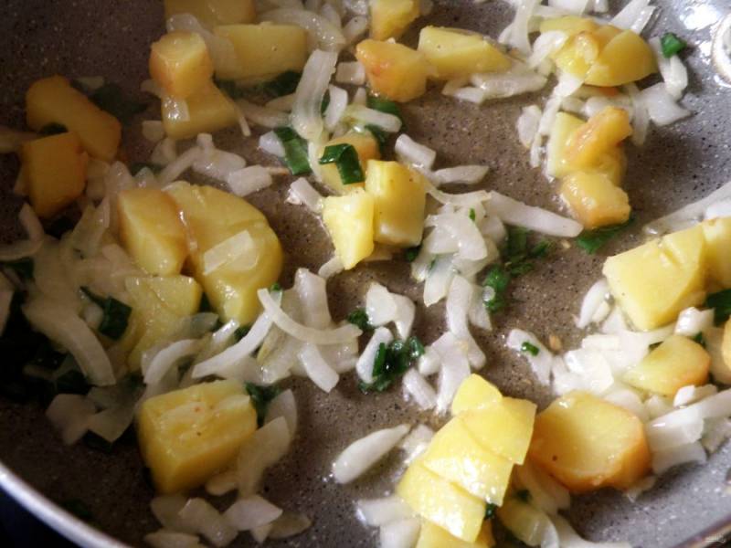 Молодой картофель сварите в мундире и остудите. Очистите или оставьте в кожуре. Нарежьте кубиками и обжарьте вместе с нарезанным зеленым луком до прозрачности лука.