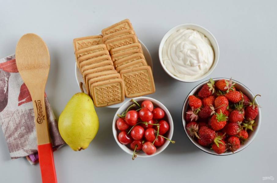 Подготовьте ингредиенты. Вместо йогурта можно добавить в десерт взбитые сливки или творожный крем.