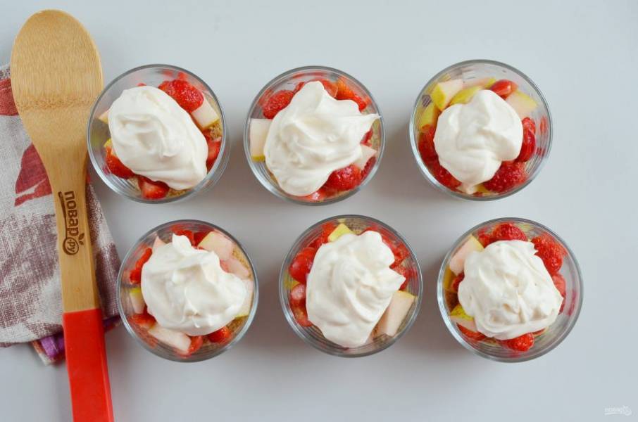 У черешен удалите косточки, порежьте половинками. Клубнику крупную на 4 части, мелкую порежьте половинками. У груши вырежьте сердцевину, если кожура жесткая, то ее тоже уберите, мякоть порежьте крупными кубиками.