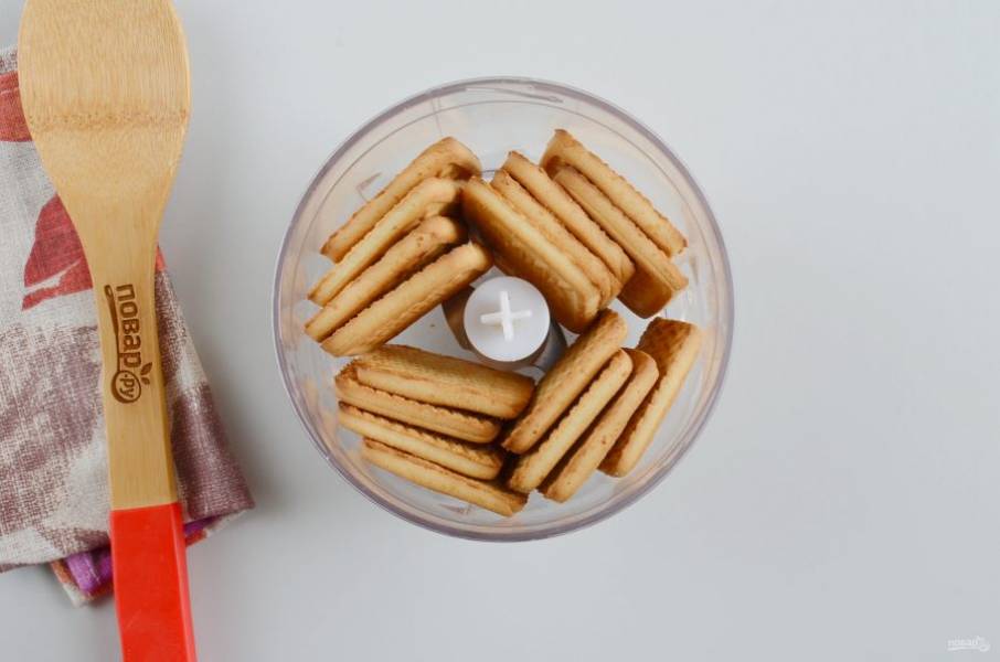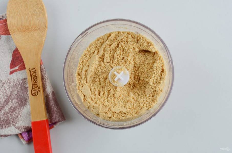 Включите на пару минут измельчитель, пока в чаше печенье не превратится в крошку.