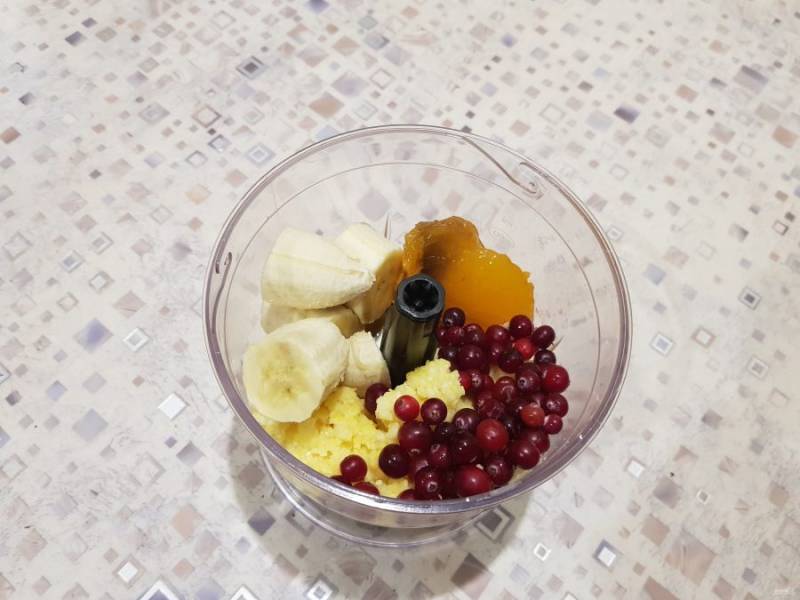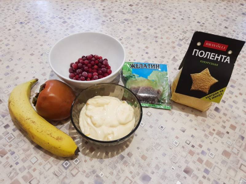 В чашу блендера поместите поленту, банан, мякоть хурмы, клюкву и взбейте содержимое в течение 3-5 минут.