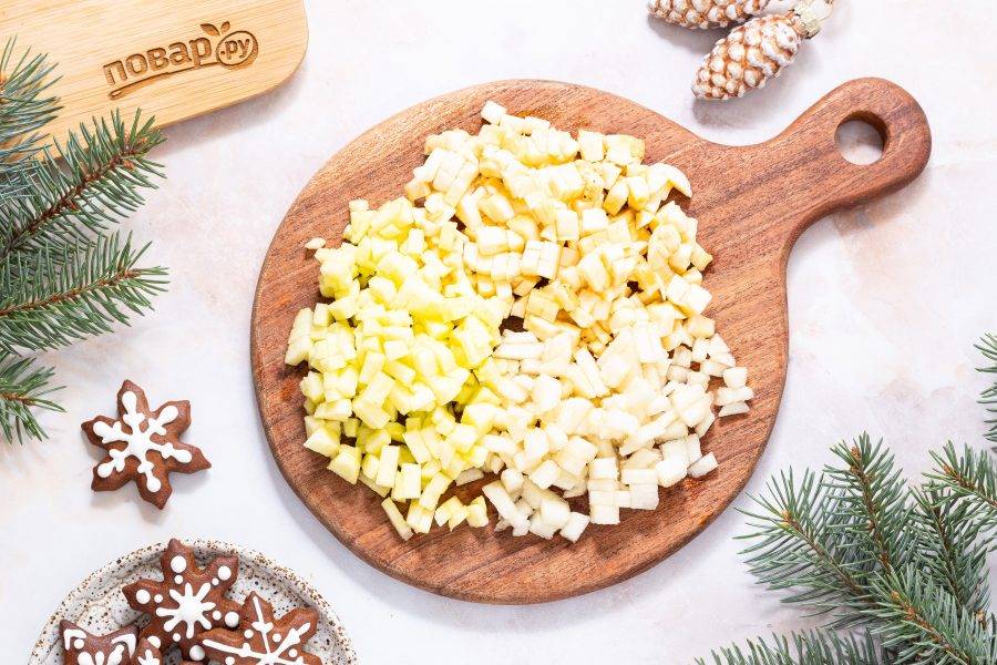 Очистите яблоко и грушу от кожуры, вырежьте сердцевину. Нарежьте на мелкие кубики. Банан тоже очистите от кожуры и порежьте на кубики.