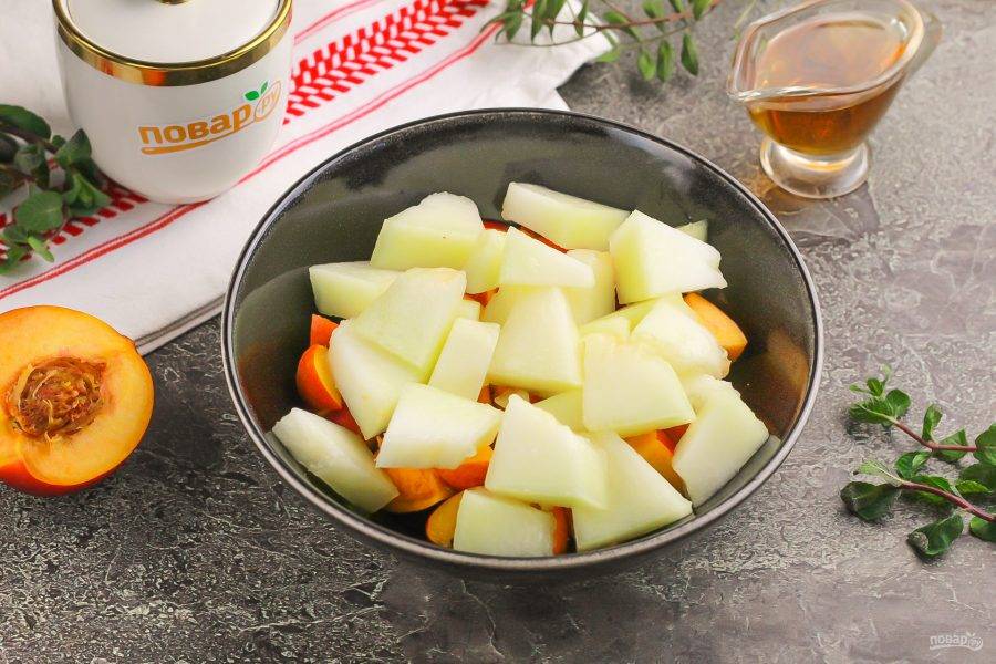 Удалите семена из дыни, с части плода срежьте кожуру и нарежьте мякоть кубиками. Добавьте в емкость.