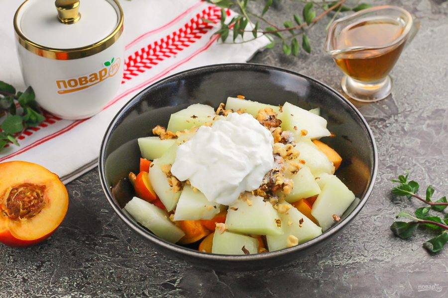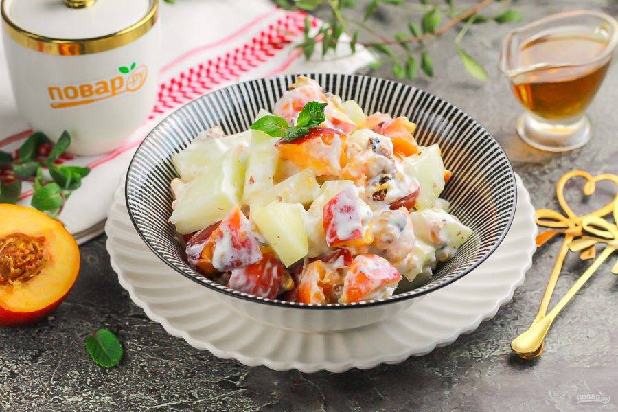 Украсьте фруктовый салат свежей мятой или присыпьте семенами кунжута. Подайте к столу и позовите сладкоежек. Приятного вам аппетита!