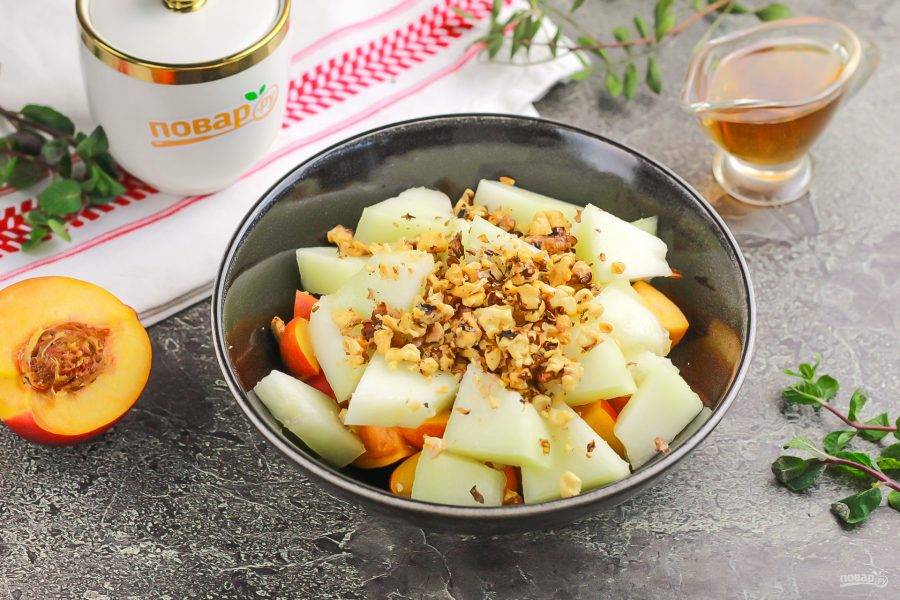 Ядра грецких орехов измельчите и добавьте в емкость к фруктовой нарезке. По желанию можно заменить грецкие орехи фундуком, арахисом и т.д.