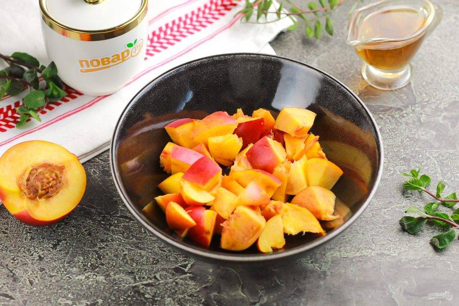 Нектарины промойте в воде, располовиньте и удалите косточки. Нарежьте половинки фруктов кубиками или ломтиками и выложите нарезку в салатник, миску.