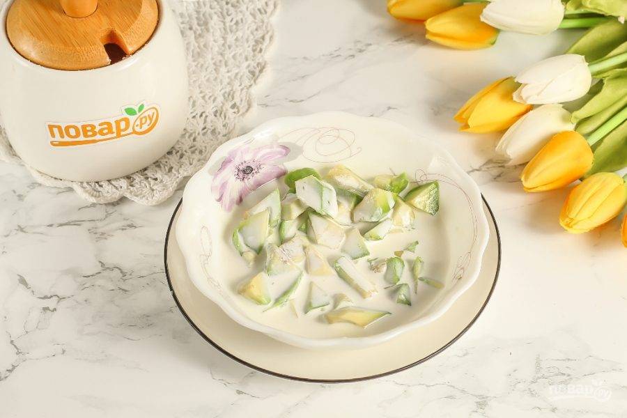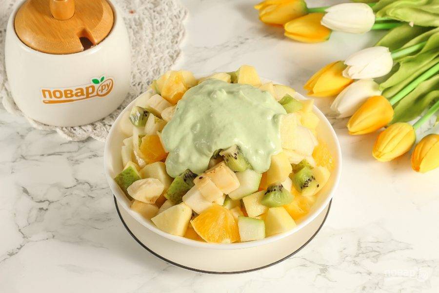 Очистите половину авокадо, нарежьте мякоть кубиками и помните ее в пиале вместе с йогуртом, перемешайте. У вас должна получиться салатная заправка. Вмешайте в нее 1 ч.л. лимонного сока, чтобы заправка не потемнела.