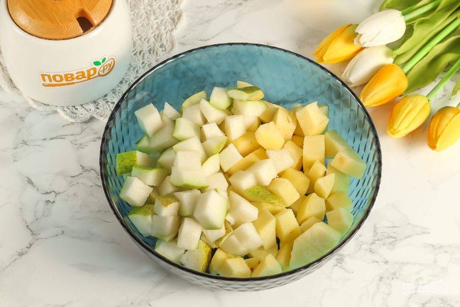 Промойте в воде яблоко и грушу. Очистите яблоко от кожуры, разрежьте фрукты на четвертинки и удалите семенные блоки. Еще раз промойте и нарежьте кубиками. Высыпьте нарезку в миску, салатник.