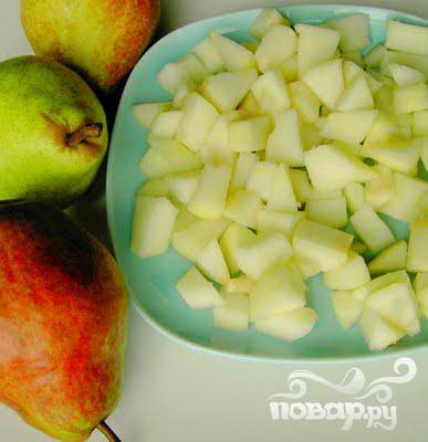 2. Грушу очистить от сердцевины и порезать кубиками. Банан очистить и нарезать ломтиками или полукольцами.