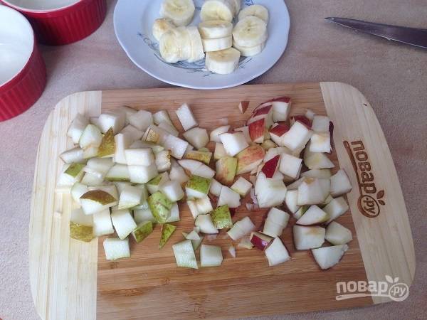 3. Грушу и яблоко нарезаем кубиками, а банан — кружочками.