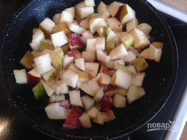 4. Смажем формы для запекания десерта сливочным маслом, оставшееся масло растопим на сковороде, добавим грушу с яблоком, посыпаем сахаром. Размешиваем и тушим-обжариваем минуты 3, до растворения сахара.