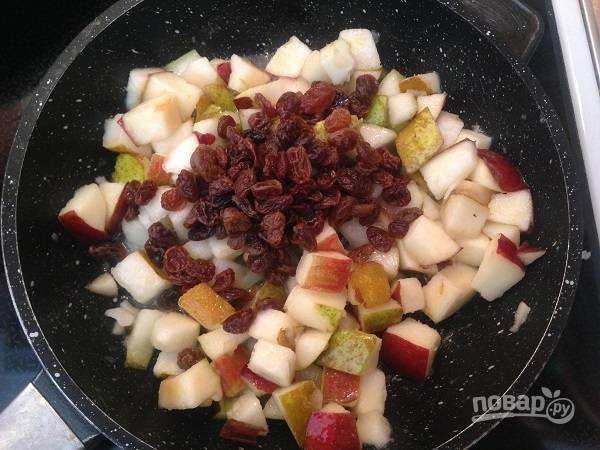 5. Добавляем на сковороду к фруктам отжатый изюм, тушим еще минут 5, до мягкости фруктов.