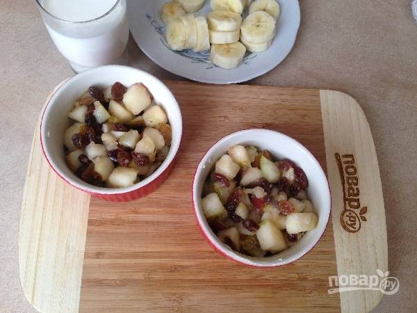 6. Выкладываем подготовленные фрукты в формочки для запекания (в несколько или в одну большую).