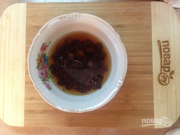 1. Для того, чтобы замочить изюм, нам потребуется ароматный чай. Завариваем его, даем немного настояться и заливаем горячим чаем изюм минут на 10.