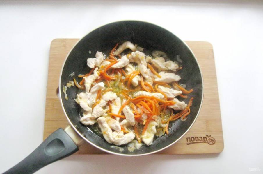 Филе индейки нарежьте тонким полосками и выложите в сковороду с морковью и луком.