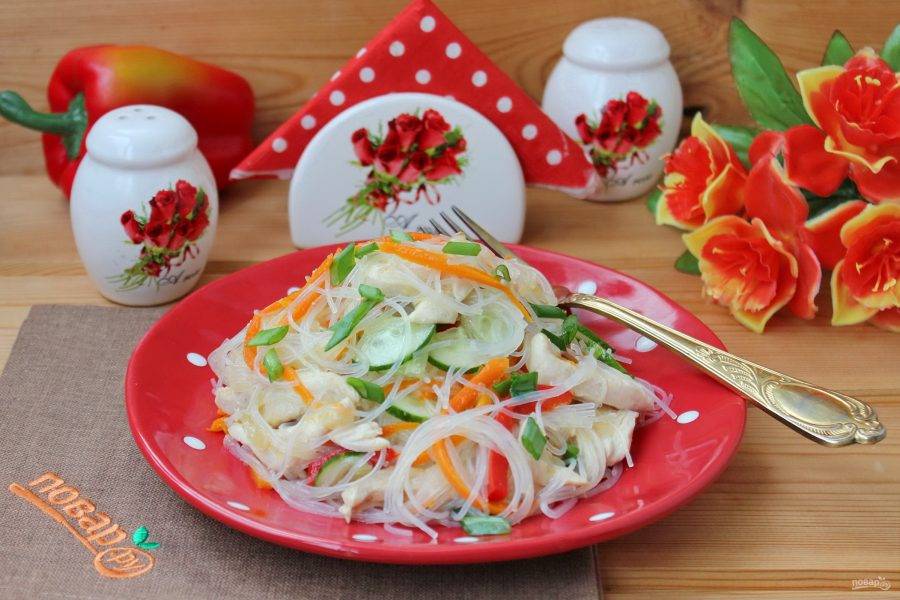 Фунчозу сварите по инструкции на упаковке. Воду слейте, а лапшу выложите в салатник с овощами и индейкой.