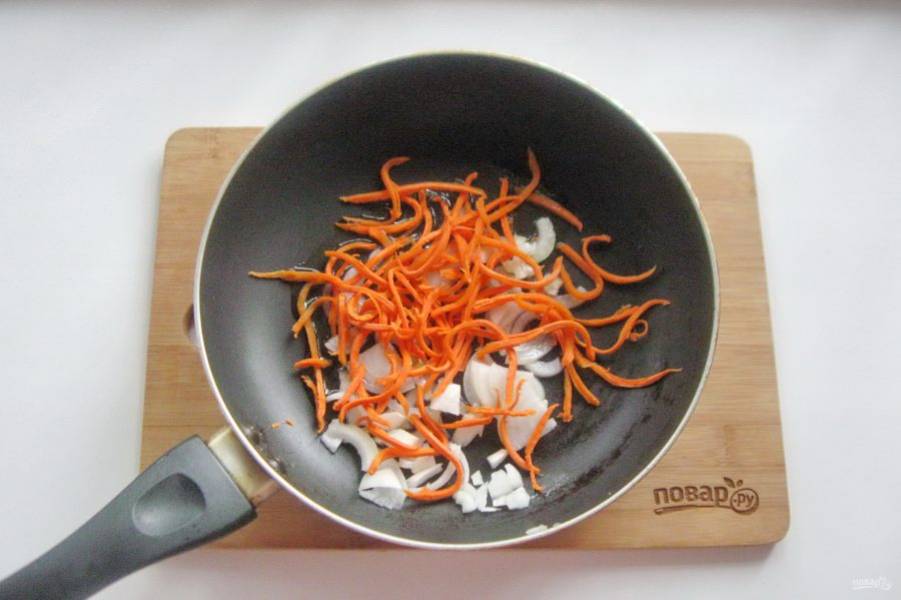 Лук и морковь очистите, помойте. Лук нарежьте произвольно, а морковь натрите на терке для корейской моркови или нарежьте тонкой соломкой. Выложите в сковороду с подсолнечным маслом. Налейте немного воды или бульона и тушите овощи перемешивая 8-10 минут.