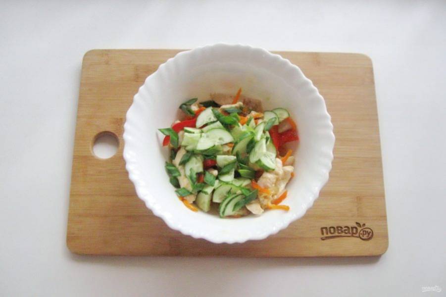 Свежий огурец и зеленый лук помойте и нарежьте произвольно. Выложите в салатник. Добавьте филе индейки с овощами.
