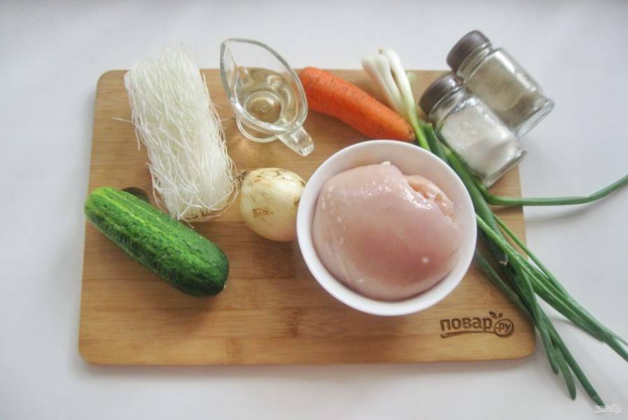 Возьмите ингредиенты для приготовления фунчозы с индейкой.