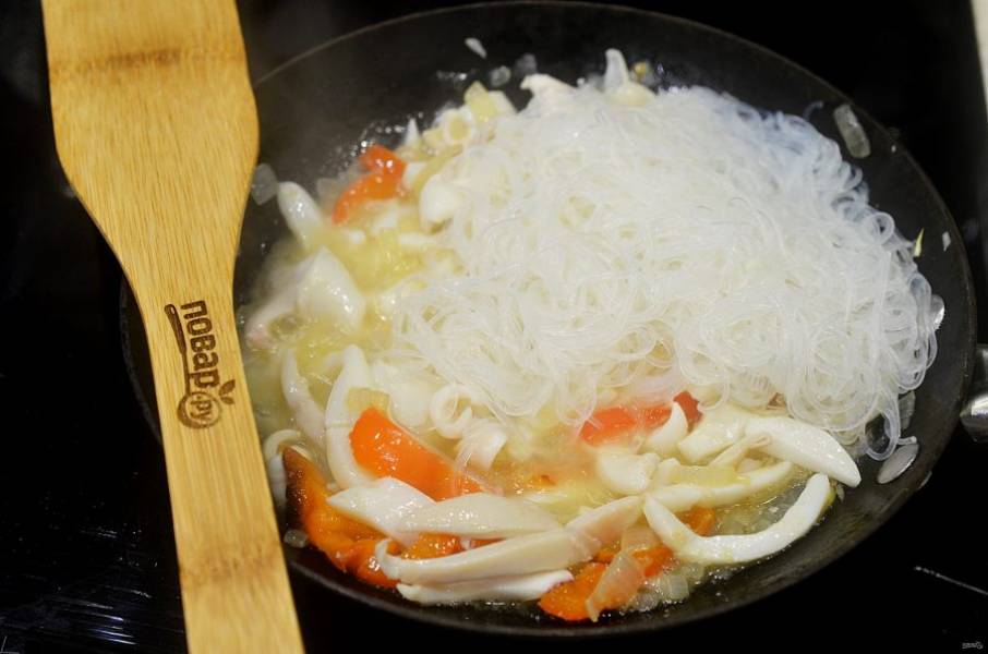 Если любите быстрые, вкусные рецепты в азиатском стиле, тогда этот рецепт точно придется вам по душе. Рисовая лапша в сочетании с овощами, креветками и кальмарами станет отличным обедом или ужином.