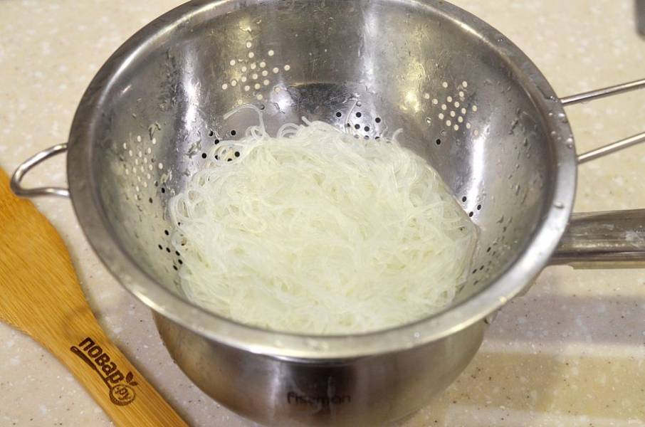 6. Рисовую лапшу отварите 3 минуты в кипящей воде. Промойте холодной водой.