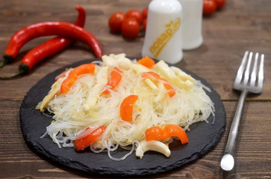 Легкий и питательный салат из фунчозы с кальмарами и овощами понравится всем любителям острой еды. Готовится такой салат легко и просто. Можете убедиться сами!