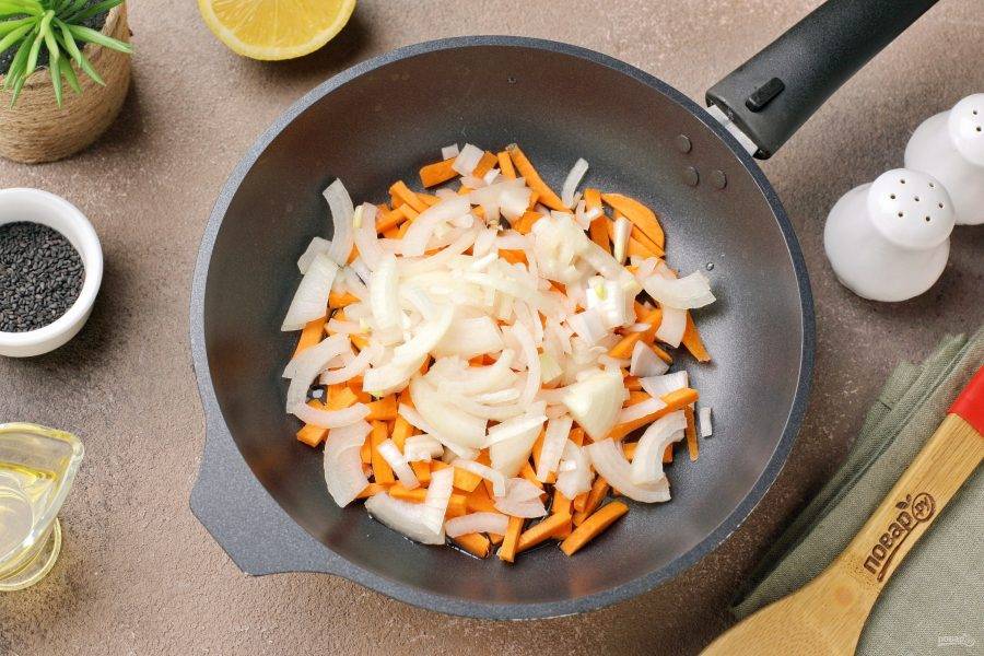 Разогрейте сковороду с маслом. Выложите нарезанную соломкой морковь и нарезанный перьями или полукольцами лук. Обжарьте овощи до мягкости.