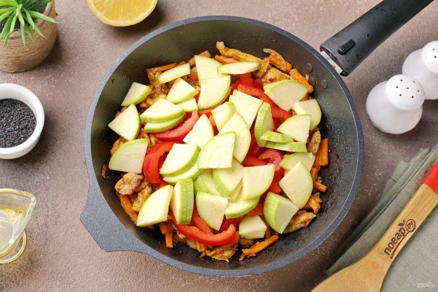 Кабачок нарежьте кружочками, а затем каждый кружок ещё на 2 или 4 части в зависимости от размера. Перец нарежьте соломкой. Добавьте кабачок и болгарский перец к куриному филе.