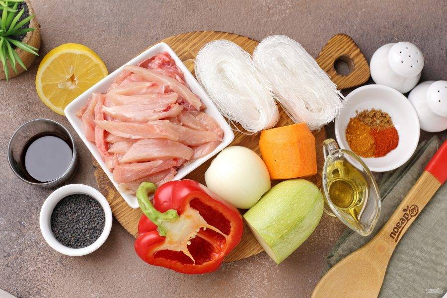 Видео рецепт "Фунчоза с курицей и кабачком"