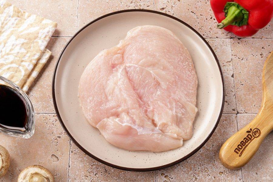 Куриную грудку промойте и обсушите, разрежьте вдоль острым ножом, не доходя немного до края и разверните как "книжку".