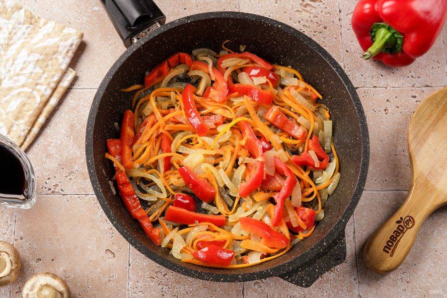 Лук нарежьте полукольцами, морковь нарежьте тонкой соломкой или натрите на специальной тёрке, болгарский перец нарежьте брусочками. Обжарьте овощи на растительном масле до мягкости.