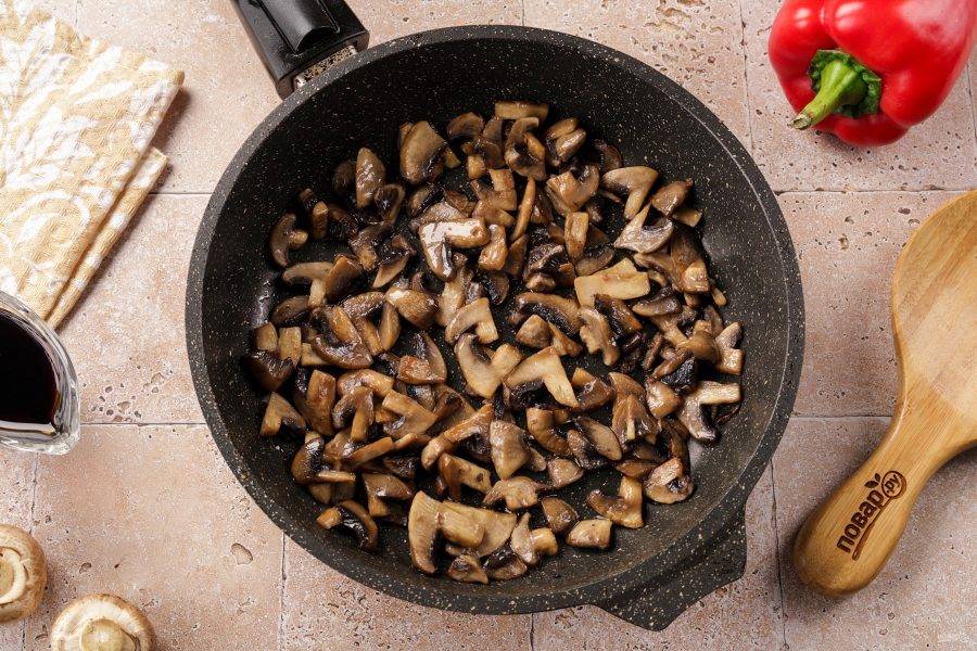 Шампиньоны нарежьте произвольно и обжарьте до испарения жидкости.