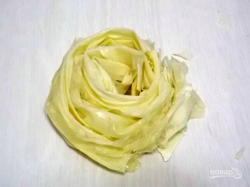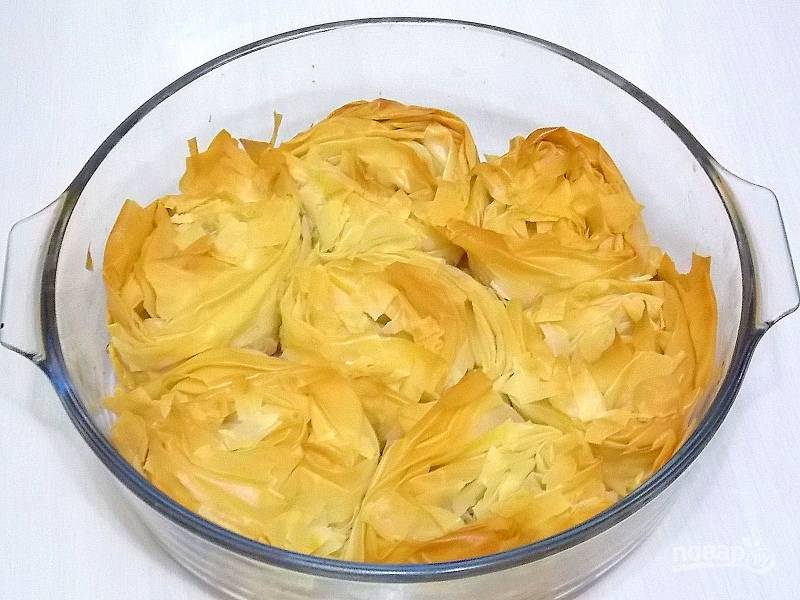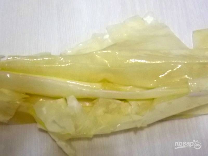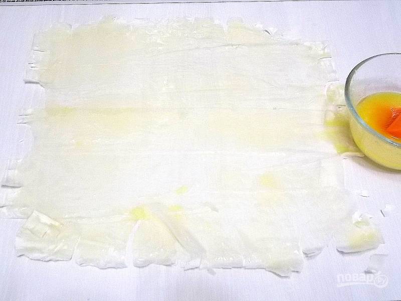 Растопите масло. Расстелите пласт теста фило и смажьте его весь маслом. Проделайте это с каждым листом теста.