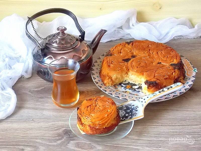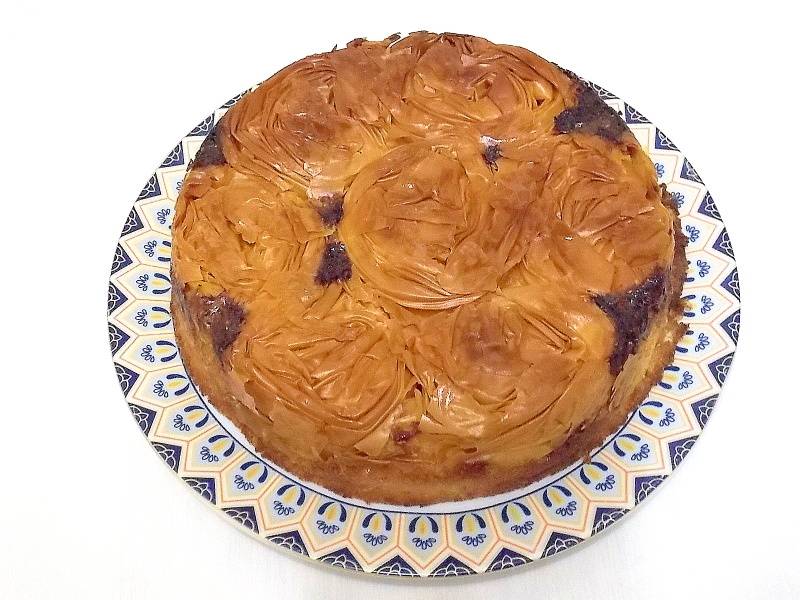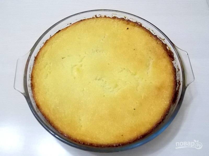 Выньте из духовке и оставьте на 20 минут при комнатной температуре. Затем проведите ножом по краю пирога и переверните его на блюдо.