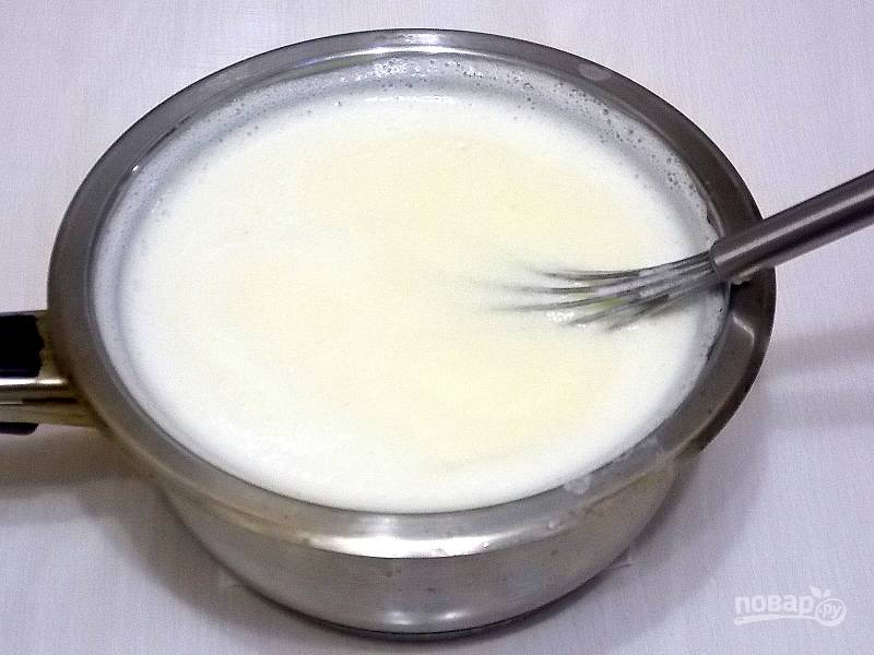 Доведите молоко до кипения. Продолжите взбивать яичную массу и влейте половину молока. Перелейте смесь в кастрюлю с оставшимся молоком и варите, помешивая, до загустения.