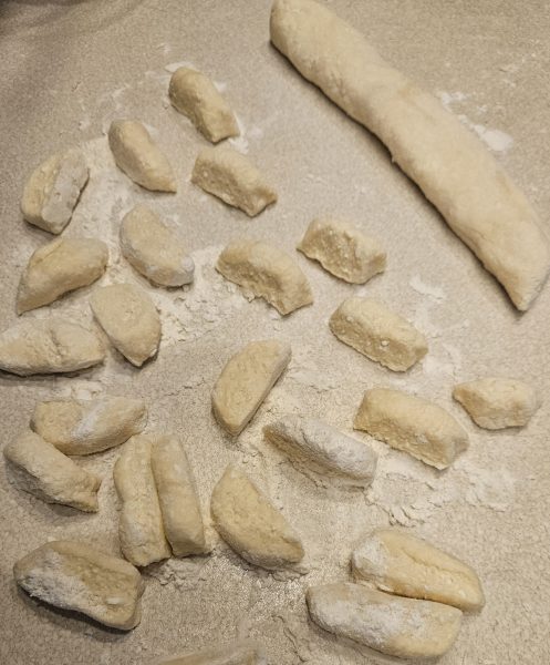 Для удобства, делим тесто на несколько частей. Из каждой части делаем колбаску и нарезаем ее на небольшие кусочки. Желательно нарезать кусочки одинакового размера.